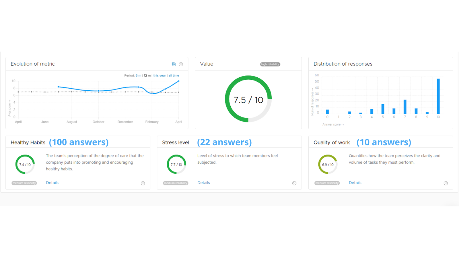 In the example of the image, it would not be correct to calculate the Wellness metric by averaging the submetrics (healthy habits, stress level and quality of work) because the number of answers in each of them is different and we would not be giving the correct weight to each of the answers.
